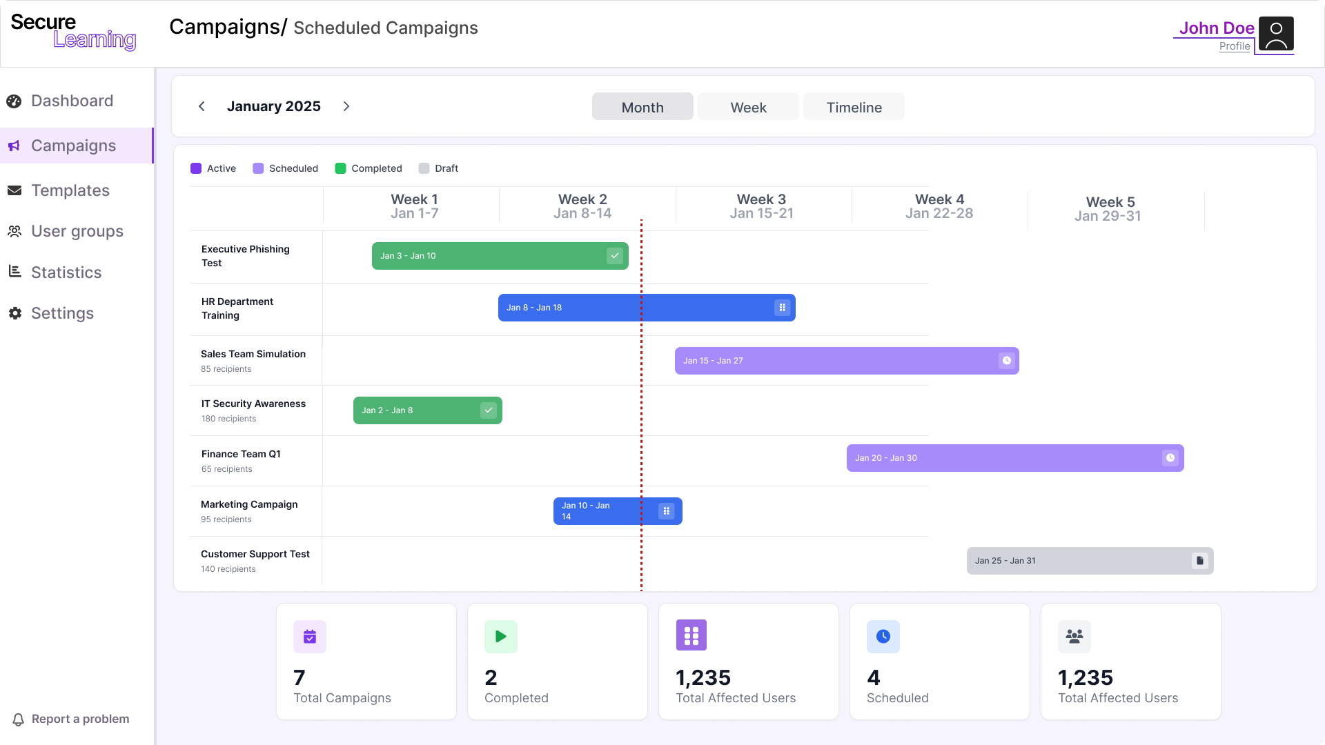 Chronological view of all campaigns: completed, running, scheduled, and drafts.