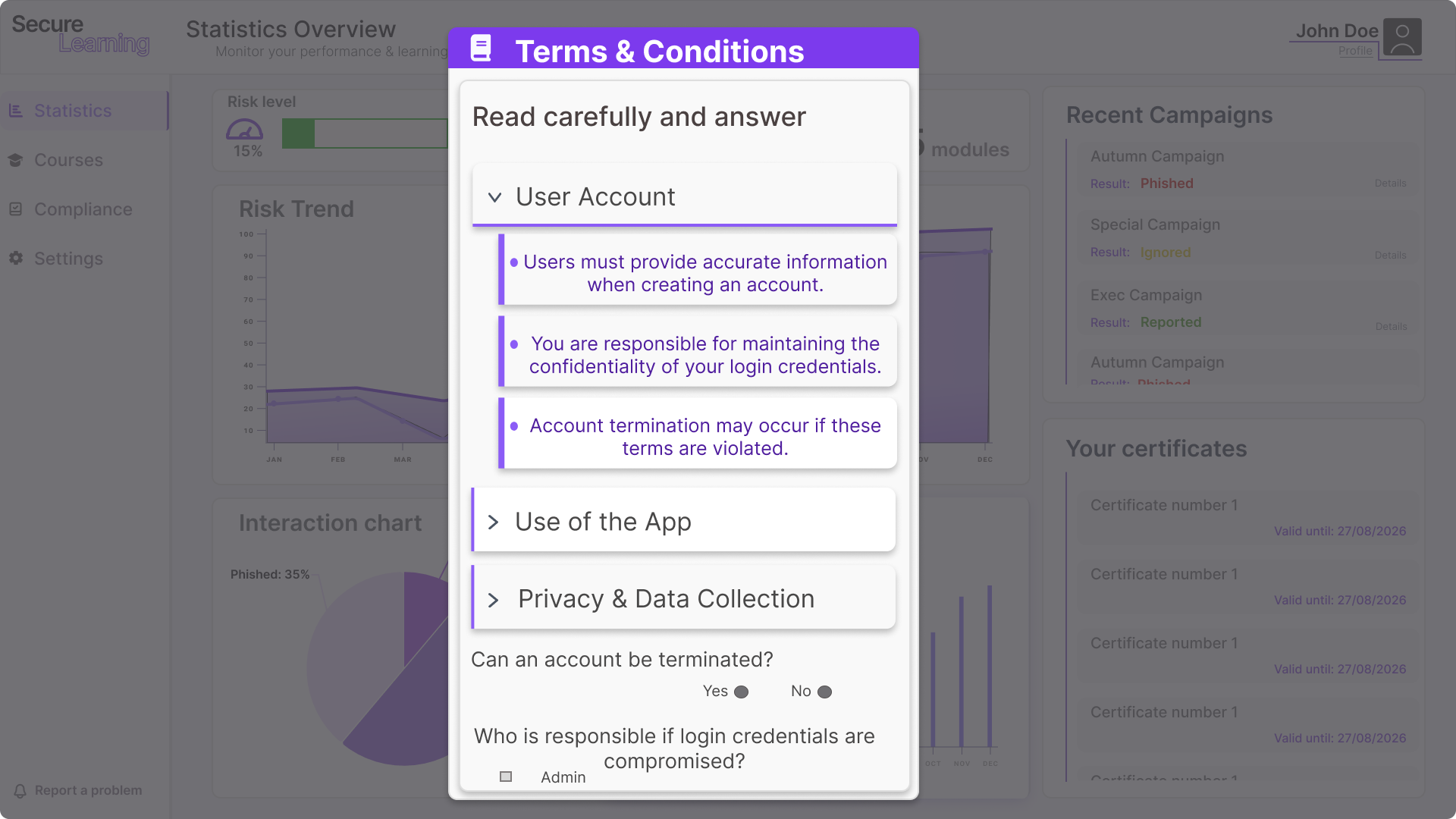 Example of the compliance modal the learner must accept before proceeding.