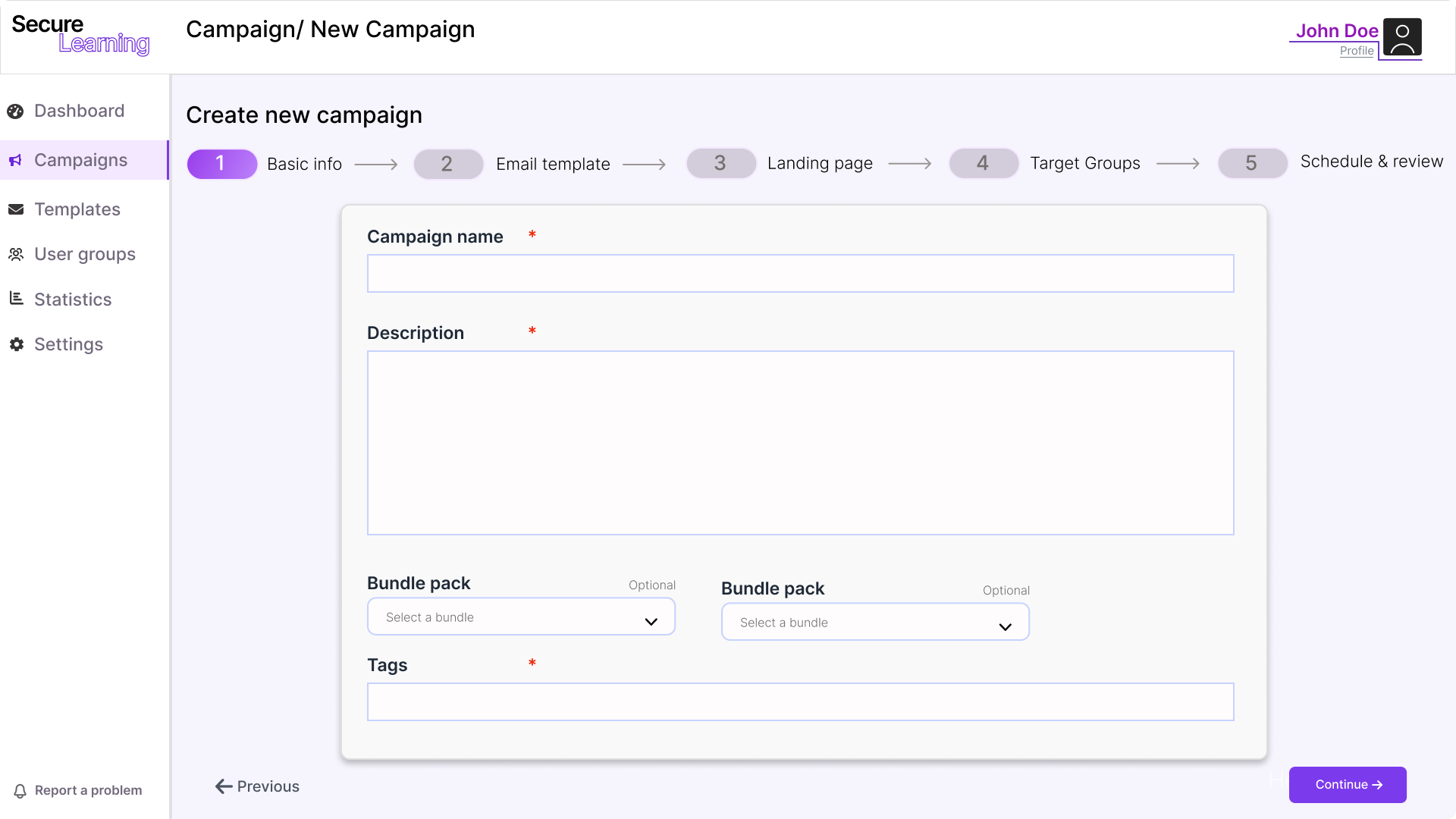 Initial screen for defining a new phishing campaign: target groups, templates, schedule, and remediation plan.