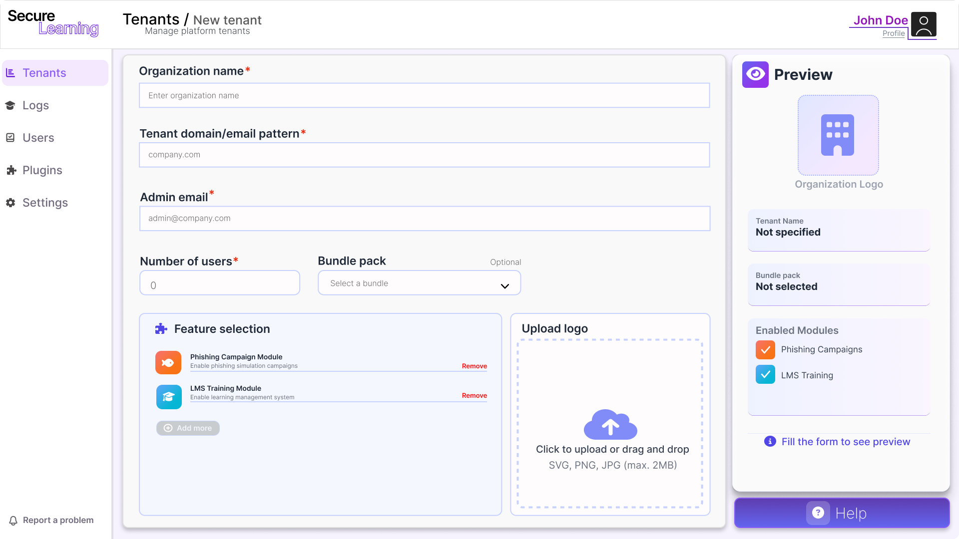 Screen for registering a new tenant, setting its domain, assigning the responsible admin, and enabling/disabling features.