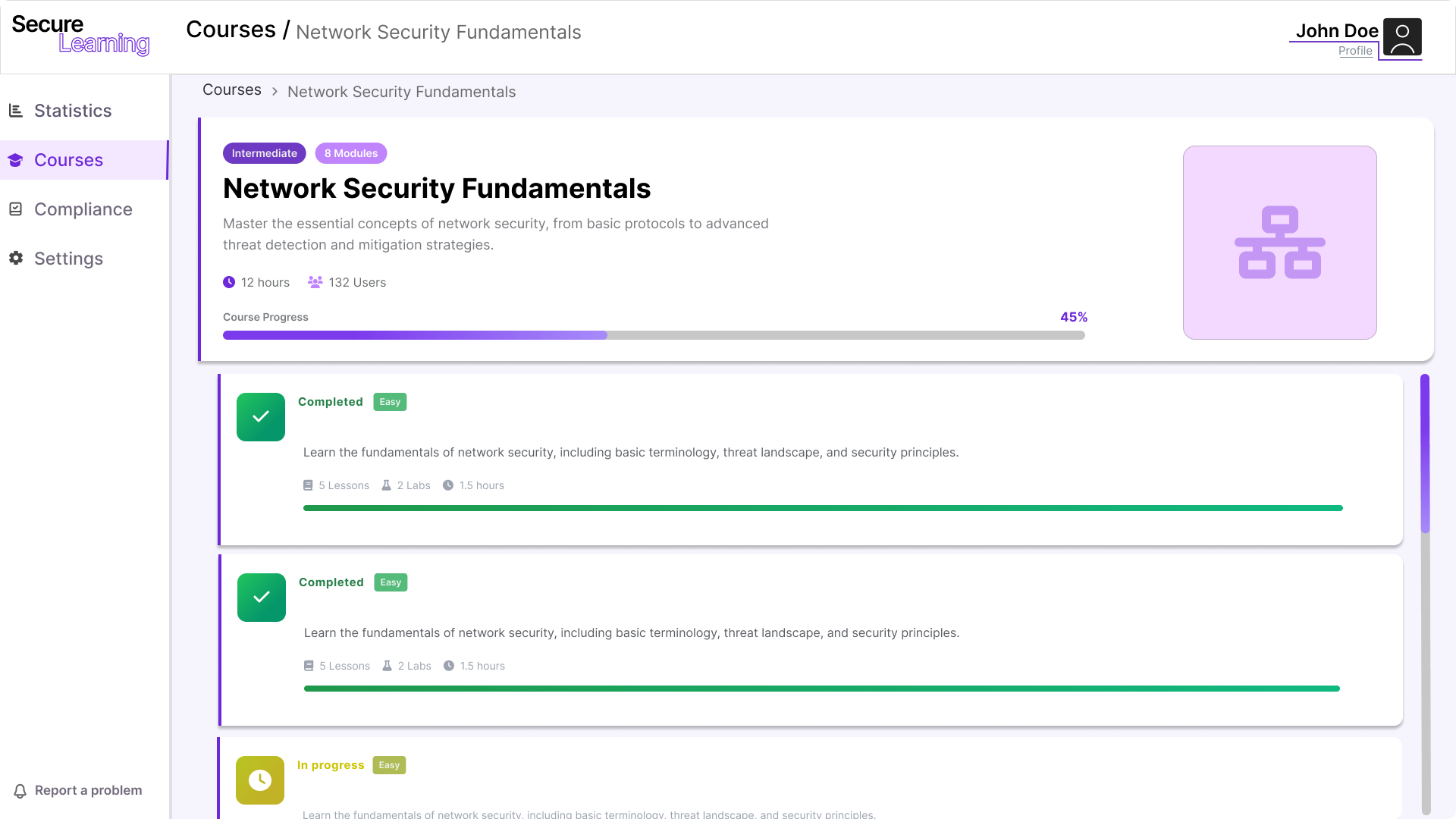 Course view showing modules, completion status, and the next actions available to the learner.