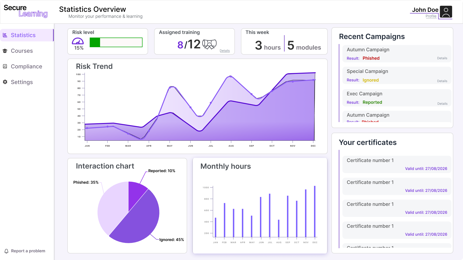 Overview of the learner’s progress: phishing simulation performance and learning achievements.